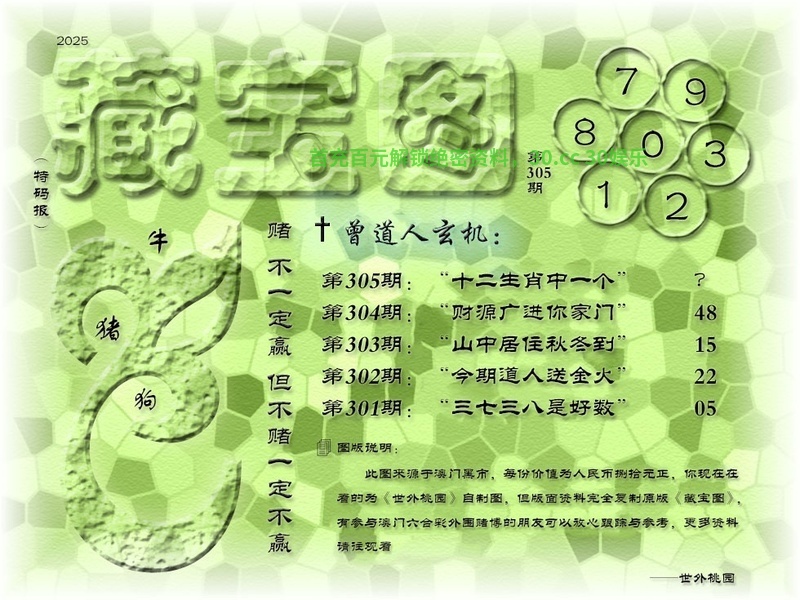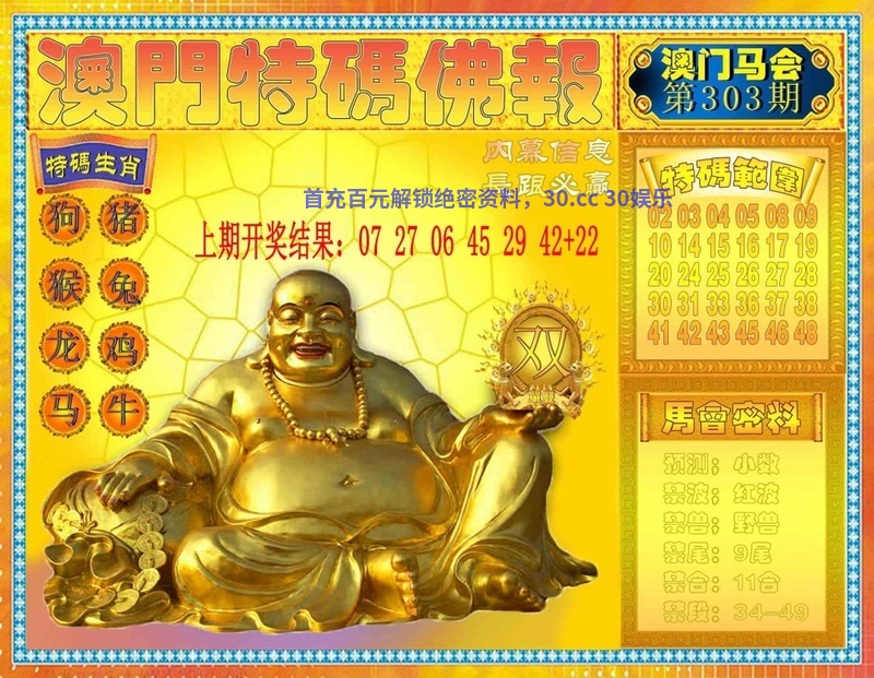 | 304期:澳门正版藏宝 【财源广进你家门】 解:财源广进你家门,解肖牛鸡猪羊马狗。 综肖:牛鸡猪羊马狗兔 |